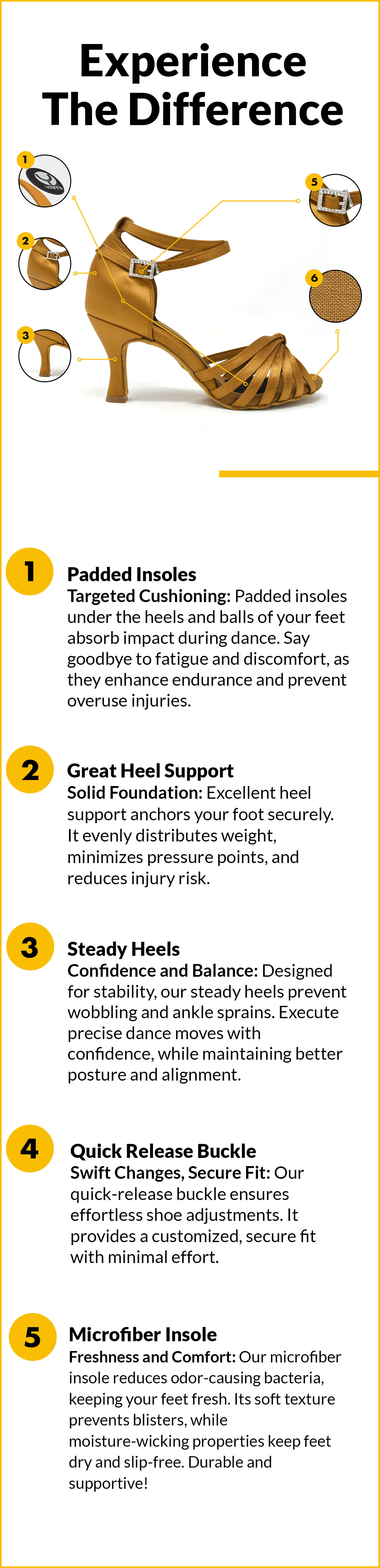 Stable and Secure: Confidence in every step! The sturdy heel and secure strap system ensure a balanced and stable foundation on any dance surface, enhancing your performance.