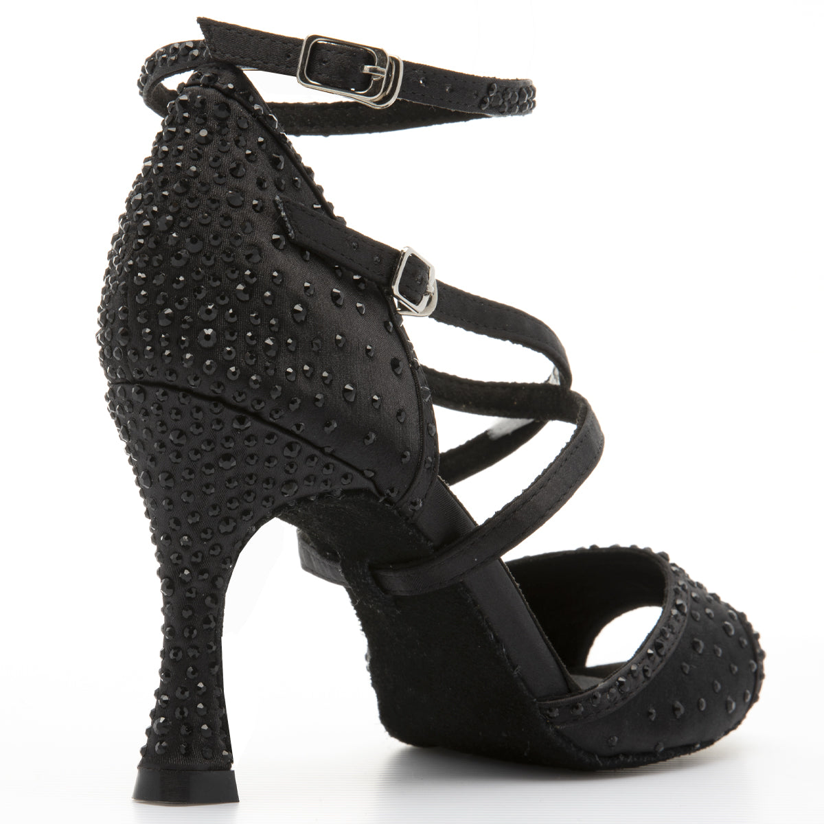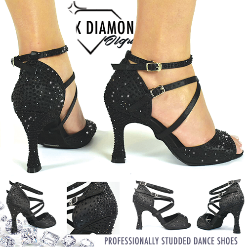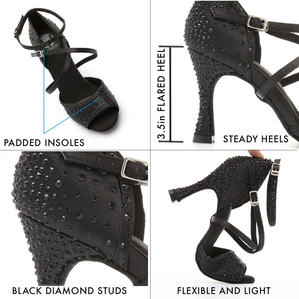Glamorous Design: The Olguita Latin Dance Shoe is made of elegant black satin material and adorned with captivating black diamond faceted studs, giving off a brilliant sheen that adds a touch of glamour to your dance attire.