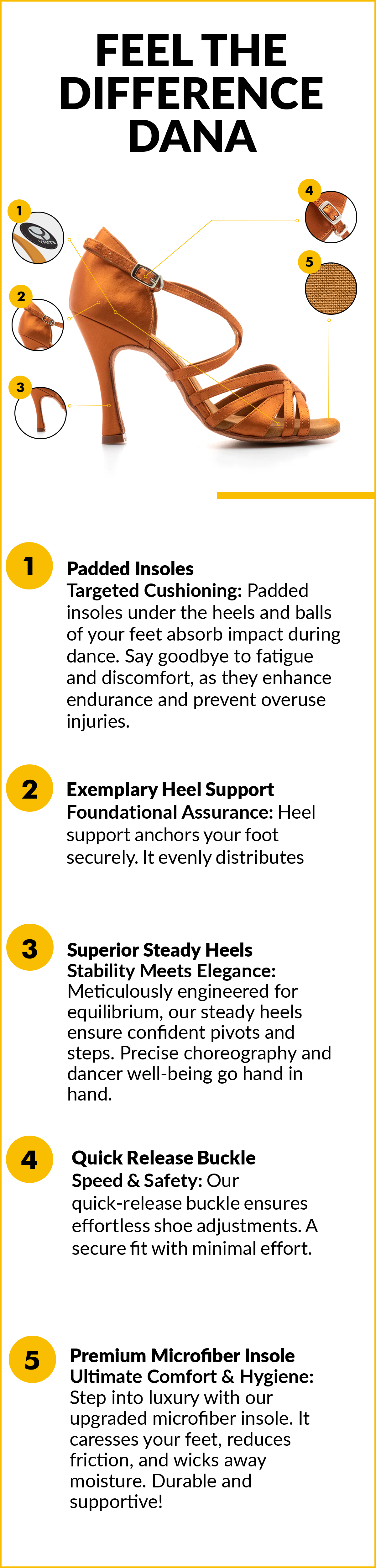 Tailored Comfort: The Dana ProFlex shoes revolutionize dance footwear with cushioned insoles that cradle your feet, providing targeted support under the balls and heels for pain-free performances.