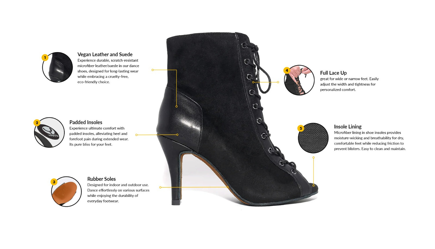 The lace-up design of the Puchi Full Lace-Up Dance Bootie allows for a customized and secure fit, making them suitable for dancers with various foot widths, including narrower feet. What I love most is that you can adjust the tightness of the boots as you feet swell from a long night of dancing.